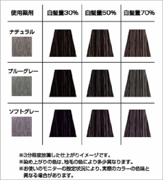 | “白髪ぼかし”とは、白髪を染めたように見せず、周囲から気付かれずにさりげなく白髪をぼかす技術です。 白髪を100%完全に染めずに、30%〜50%のグレーで自然にぼかします。 | |||||||