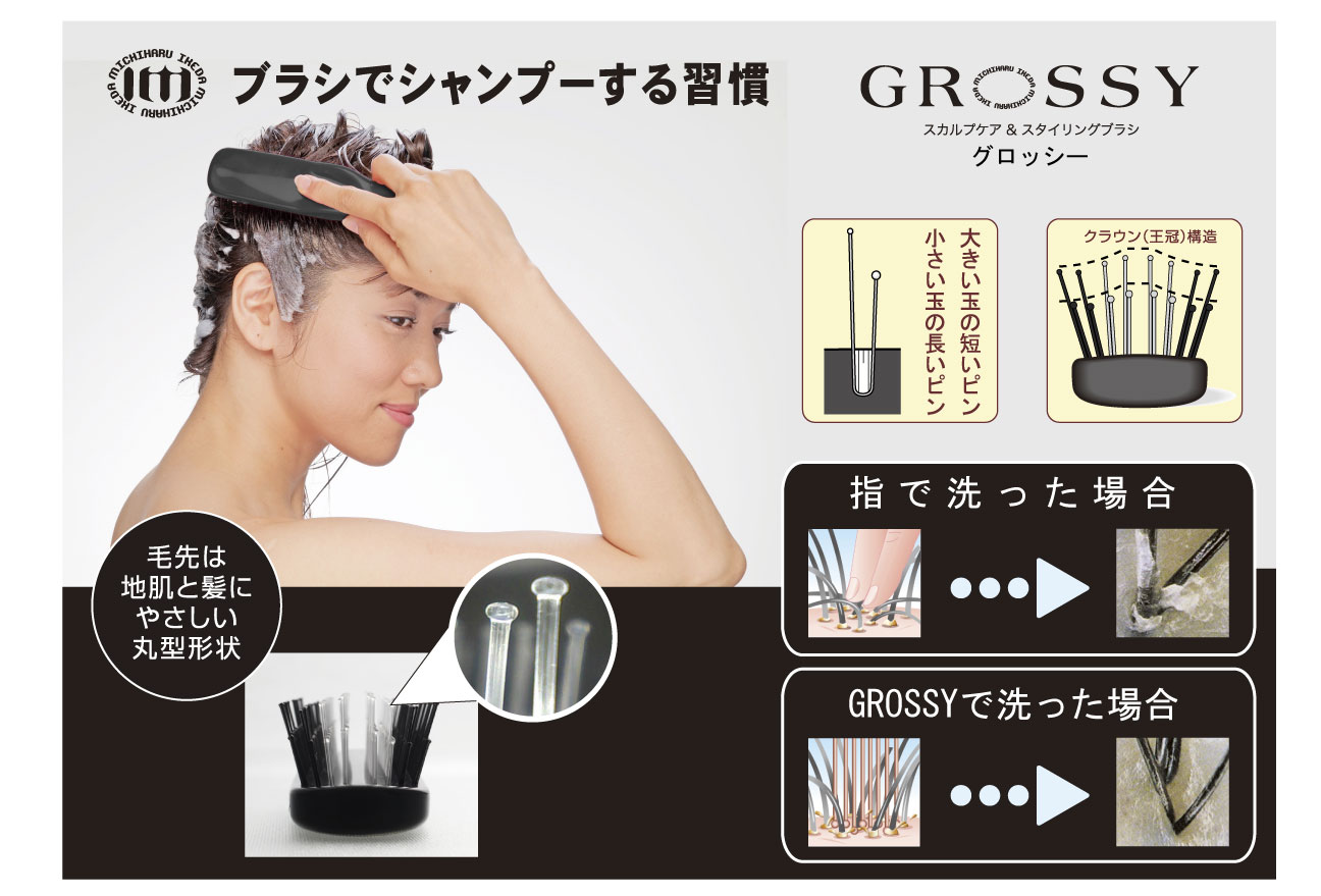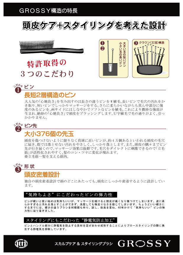 ピン先が376個と数が多いだけでなく、真球に近い状態に仕上げていることで頭皮を傷つけにくい構造にしており、第三者機関によって、ピン先が頭皮を傷めないという試験結果も取得しております。また、頭皮に密着する形状で特許を取得。髪通りを考えた長短2種類のピンが心地よく頭皮をマッサージすると同時に頭皮の汚れを丁寧に落とします。