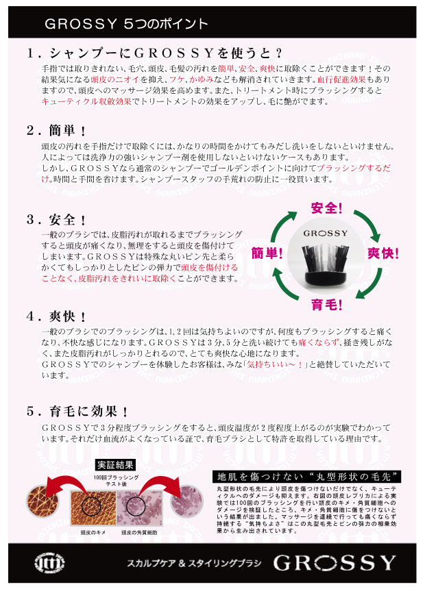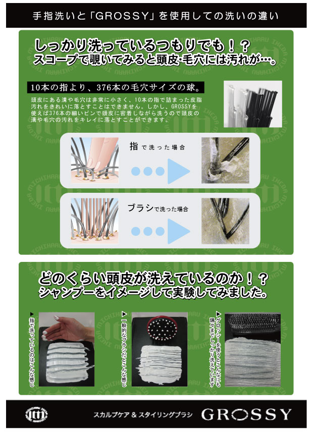 通常のシャンプーブラシはゴムやプラスチックでできている物が多く、ピンにしなりがなく、力を入れすぎると頭皮を傷つける恐れがあります。またピンの先が太いものが多くピン数も少ないので、毛穴や頭皮の汚れに対してきめ細やかに落としきれない可能性があります。当社のブラシは4万個あると言われている毛穴を意識をし、頭皮に密着するような設計と小さく先の丸いピンをつけることで抜群に気持ち良く、汚れをきちんと落とせるような設計にしております。