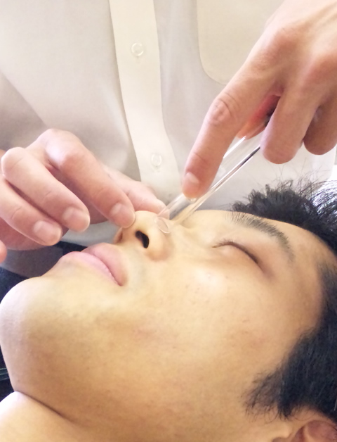ヴァックスプレイ<吸引> ガラス管を使用して毛穴に詰まった皮脂を吸引します。 (吸引後、ガラス管で除去した皮脂をご確認いただけます。) |