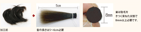 基本的にはお送り頂いた胎毛のみで可能なサイズの筆を製作いたしますが、製作が不可能な場合は、下記のような方法があります。